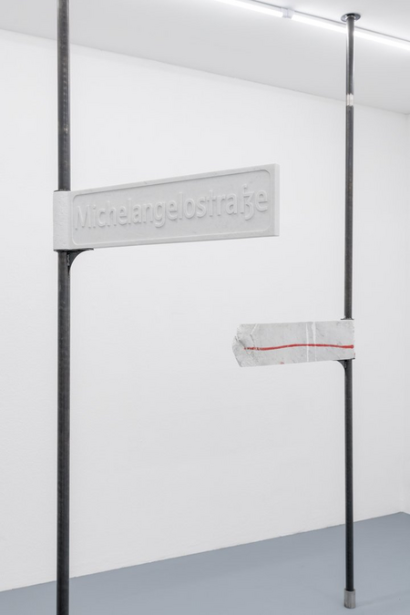 The work Michelangelostraße displays the street sign of his studio address carved into marble installed on a metal pole. Here he builds a narrative bridge between the mastermind of the renaissance, and the unassuming GDR street which was named in honour of his 400th birthday in 1964. Michelangelostraße non finito is a reference to the art historical term of the unfinished, which when aesthetically recognised acts as an artwork with the same qualities as a completed piece. Rough edges, the appearance of an idea and the possibility of completion in the eye of the viewer refer to this multi-layered sculptural category. Through these choices, Liese continually links this historical narrative with his current context for artistic production, a post-soviet industrial park in between high-rise blocs and a neighbouring Norma supermarket, without imposing a hierarchy of value between the two. He remains a vigilant, impartial observer, challenging how our physical and virtual environments are perceived and defined.