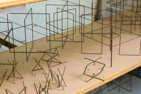 Bild: Kleinformatige Drahtmodelle (Detail) [Small-scale wire models (detail)], undated, undatiert, aufgenommen in Granwehrs Atelier an der Südstrasse 81, Zürich. Foto: Peter Koehl, Othmarsingen. © 2021 ProLitteris, Zürich, Nachlass Florin Granwehr *