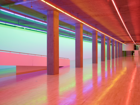 Das Licht bewirkt differenzierte Farbprojektionen auf Boden, Wände und Einbauten – aber auch auf den Körper des Besuchers oder der Besucherin. Ohne die Architektur zu verstellen, erzeugt Flavins Installation neue Akzentierungen und Wahrnehmungsmöglichkeiten des Raums.