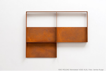 Die überwiegend mehrteiligen Skulpturen von RIKI MIJLING sind auf ein Minimum, auf wenige Grundelemente reduziert und verdeutlichen damit den Prozess von einer Komplexität zur Einfachheit. Dem Essentialismus verpflichtet geht die Künstlerin dabei bedacht vor: in der Wahl von Formen, Leerräumen, Proportionen und Volumen, in der Wiederholung von Formen und Auslassungen, in der Balance zwischen Linien und Flächen, zwischen Raum und Fläche sowie zwischen Dynamik und Ruhe. In ihrem künstlerischen, nicht von Intuition geleiteten Prozess der Reduktion kommen mathematische Systeme wie beispielsweise die Fibonacci-Reihe zur Anwendung, jedoch ohne großen Einfluss auf das Endergebnis. Ihrem radikal verfochtenen Essentialismus mit präzisen, reduzierten, linearen Formen steht eine nahezu malerische Dimension der Oberfläche gegenüber, welche durch die Bearbeitung des Stahls, beispielsweise durch Rostpatina, entsteht und Spannung zwischen Form und Fläche erzeugt.