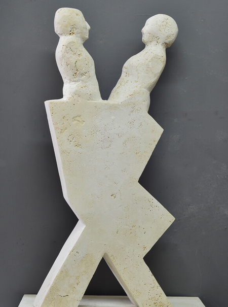 Als Bildhauer hat Hans-J. Müller (geb. 1952) eine Handschrift entwickelt, die aus den geometrischen Sockeln seiner Plastiken menschliche Figuren emporwachsen lässt.