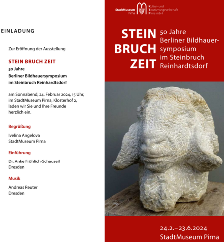 Das StadtMuseum Pirna zeigt anlässlich des Jubiläums von einem halben Jahrhundert Arbeiten, die während der Symposien in Reinhardtsdorf geschaffen wurden. Die Künstlerinnen und Künstler Eva Backofen, Günter Blendinger, Marguerite Blume-Cárdenas, Inka Gierden, Karin Gralki, Ursula Güttsches, Sigrid Herdam, Ulrich Jörke, Liz Kratochwil, Karl Möpert, Emerita Pansowová, Robert Schmidt-Matt, Karin Tiefensee, Annette Tucholke-Bonnet und Berndt Wilde präsentieren Skulpturen aus Sandstein und Arbeiten auf Papier.