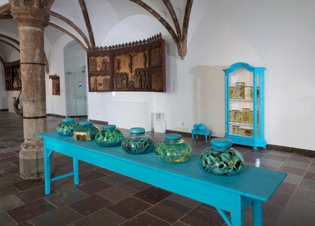 Durch Anja Schindlers Gottorfer Arbeiten zieht sich die Beschäftigung mit Pflanzen und deren Relikten. Im 17. Jahrhundert genoss die nördlich des Schlosses gelegene Gartenanlage, der heute rekonstruierte Barockgarten, weite Berühmtheit. Mitten im Dreißigjährigen Krieg beauftragte Herzog Friedrich III. ab 1637 seinen Hofgärtner Johannes Clodius mit dieser Anlage, die sein Nachfolger Herzog Christian Albrecht ab 1660 um vier Terrassen glanzvoll erweiterte. Eine Besonderheit war der Garten insbesondere wegen der hier versammelten botanischen Raritäten. Er bildete das lebendige Gegenstück zur Kunst- und Wunderkammer des Herzogs. Beides entsprang sowohl den ausgeprägten wissenschaftlichen Interessen Friedrichs III. und Christian Albrechts als auch barocker Sammelleidenschaft. Anja Schindler hat sich von den dort einst angepflanzten Spezies anregen lassen und sie in getrockneter und blau verwandelter Form ins Schloss geholt: Einige der kostbaren Fayence-Vasen und Blumen-Steckkästen des 18. Jahrhunderts aus der Museumssammlung erhalten so auf Zeit ihre historische Funktion zurück und verwandeln sich zugleich in zeitgenössische Plastiken.