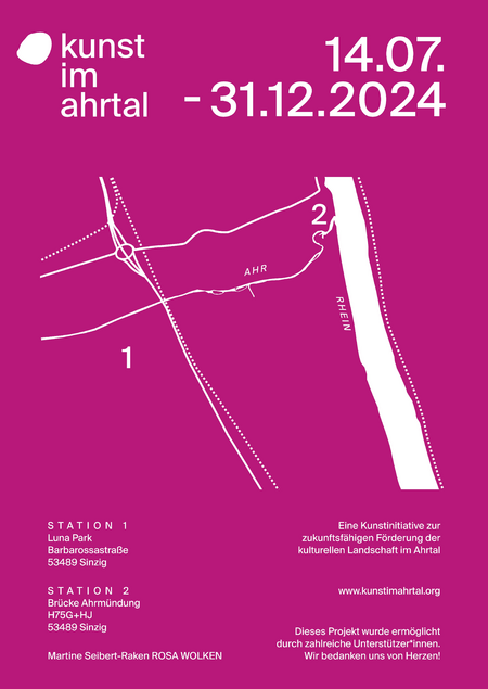 Den Auftakt der Ausstellungsreihe gibt die in Unkel am Rhein lebende Bildhauerin Martine Seibert-Raken mit ihrer Serie Rosa Wolken. Im Herzen der Stadt Sinzig, dem idyllischen Luna Park, sowie an der inzwischen neu errichteten Ahrmündungsbrücke, installiert die Künstlerin jeweils eine wolkenähnliche Skulpturenlandschaft und symbolisiert die unsichtbaren Fäden, die Menschen und Orte miteinander verbinden. Wie „Wolken der Gemeinschaft“ verkörpern beide Kunstorte die Idee der grenzenlosen Einheit: Wolken kennen keine physischen Barrieren, bewegen sich frei am Himmel und verbinden verschiedene geografische Orte, genauso wie die Kunst Menschen aus unterschiedlichen Lebensbereichen zusammenbringt.