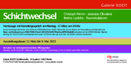 ich lade Sie sehr herzlich zur Vernissage der Ausstellung „Schichtwechsel“ mit abstrakten Ölbildern von Christoph Primm und schwarzen Raumskulpturen von Bettina Lüdicke am Montag, 17.3. um 19 Uhr in die Galerie ROOT ein.