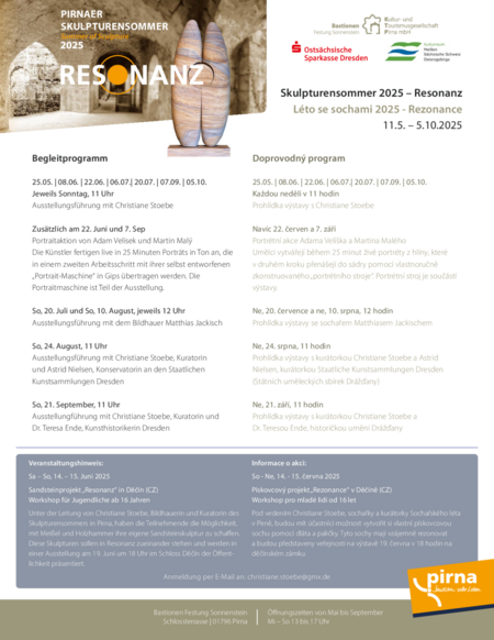 Der Pirnaer Skulpturensommer wird auch 2025 freundlich unterstützt durch die Ostsächsische Sparkasse Dresden sowie vom Kulturraum Meißen - Sächsische Schweiz-Osterzgebirge und ist geöffnet mittwochs bis sonntags sowie feiertags von 13 bis 17 Uhr. Wir empfehlen die Anreise mit der Bahn bzw. dem ÖPNV. Zur Ausstellung ist ein Katalog erschienen.
