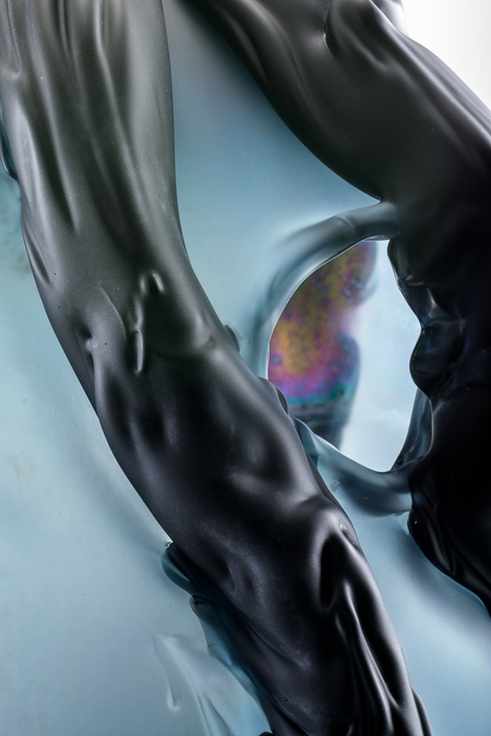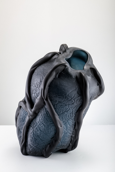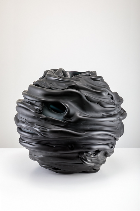 Meine neuesten Skulpturen aus der Serie „Ocean Bark“ beginnen ihre Reise in Murano, wo ein Meisterglasbläser jede Kugel herstellt. Nachdem das Glas seine Rindenstruktur erhalten hat, öffne ich die noch heißen Kugeln an strategischen Stellen und enthülle ein zartes, schimmerndes Inneres, das an Wasser selbst erinnert.