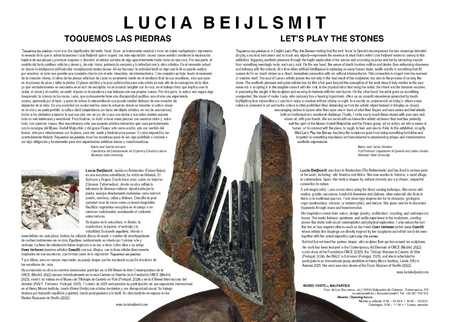 Toquemos las piedras or in English Let’s Play the Stones—noting that the verb ‘tocar’ in Spanish encompasses the two meanings intended (to play a musical instrument and to touch any object)—represents the essence of what Dutch artist Lucia Beijlsmit wants to convey in this