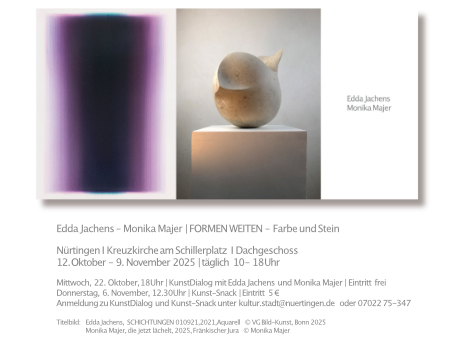 Die Malerin Edda Jachens und die Bildhauerin Monika Majer sind Poetinnen, deren ganz unterschiedliche Werke - durscheinende abstrakte Aquarelle und fein anmutende Steinskulpturen - auf wunderbare Weise zusammenklingen.
