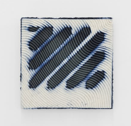 Copying, mimesis, repetition is the essence of our culture. Although the West seeks the utopia of the “unique and original” piece, China clings to the mutable and the process of drift, doing so through shanzai: adapting the copied until it becomes something else. Barreiro deconstructs this ontological framework by turning it on its head: the copy, the serial piece, which can be repeated infinitely, becomes a work of art. He takes traffic signs — arrows, triangles, mandatory rings, warning diagonals — and grafts them onto plaques and volumes worked in white paste. Cobalt oxide — the historic colour of Portugal, of tiles and Vista Alegre — appears in gradients that emerge from the relief: spikes, grooves and meshes that capture the pigment.