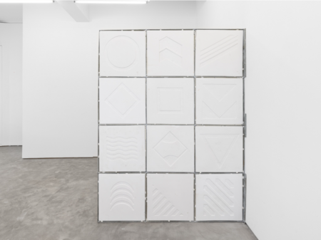 Copying, mimesis, repetition are the essence of our culture. Although the West seeks the utopia of the “unique and original” piece, China clings to changeability and the process of drift, doing so through shanzai: adapting the copied until it becomes something else. Barreiro deconstructs this ontological framework, inverting it: the copy, the mass-produced piece, which can be repeated infinitely, becomes a work of art. He takes traffic signs — arrows, triangles, mandatory rings, warning diagonals — and grafts them onto plaques and volumes worked in white paste. Cobalt oxide — the historic colour of Portugal, of its tiles and Vista Alegre porcelain — appears in gradients that emerge from the relief: spikes, striations and meshes that capture the pigment.