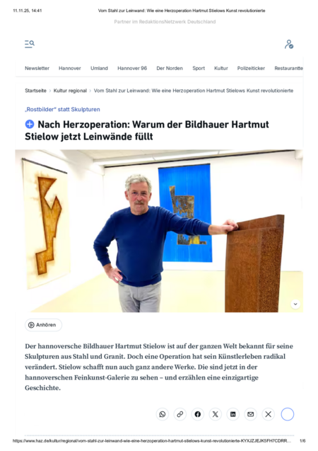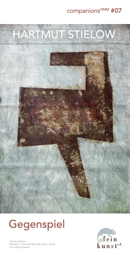 Nach mehr als vierzig Jahren bildhauerischer Praxis, in der die dialektische Beziehung von Stahl und Granit im Zentrum steht, betritt Hartmut Stielow mit seinen grafischen Arbeiten, den sogenannten „Rostdrucken“, Neuland. Plastik und Grafik, dort die Entwicklung der Figur im Raum, hier die Gestaltung der Bildwelt in der Fläche: Größer könnte der Unterschied in der künstlerischen Vorgehensweise kaum sein. Und doch entwickelt Stielow seine Grafiken konsequent aus der Bildhauerei, wendet auch in ihnen die Prinzipen von Tragen und Lasten an, experimentiert mit Material-Kombinationen und setzt Werkstücke aus seiner plastischen Arbeit als Bildelemente in den Rostdrucken ein. Die aktuelle Ausstellung im Feinkunstraum geht diesem beziehungsreichen Gegenspiel von Grafik und Plastik nach.