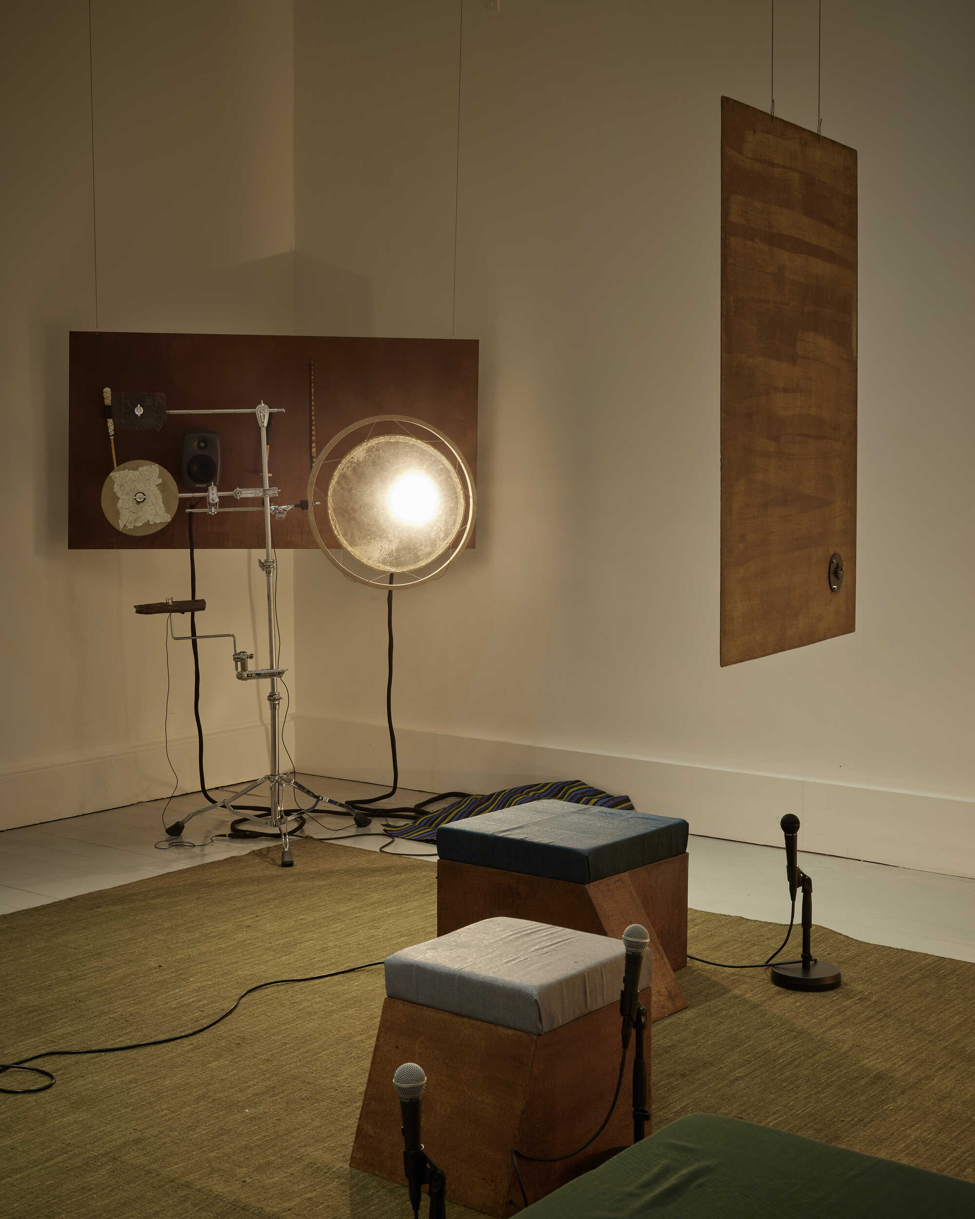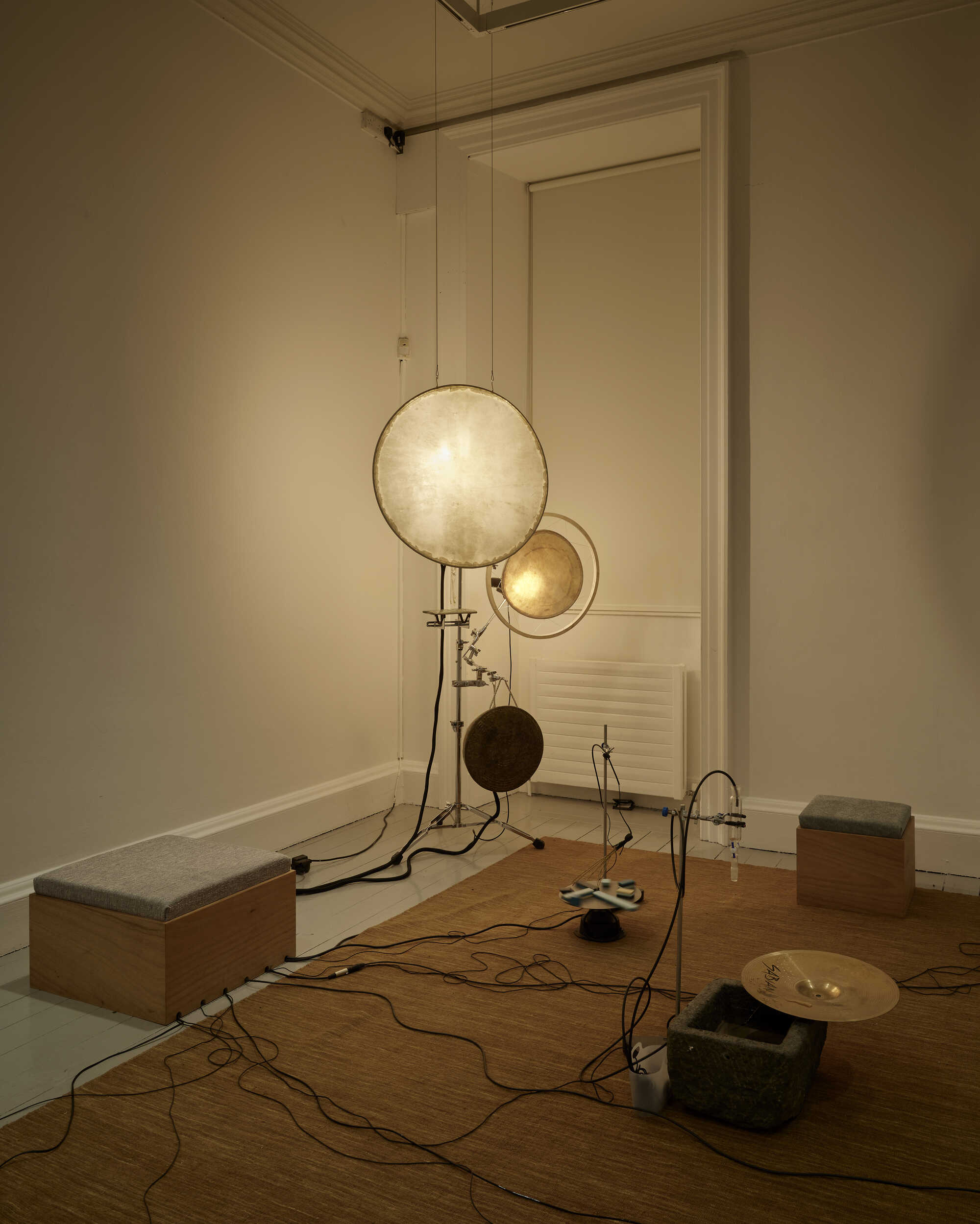 In Gallery 3 Atoui introduces a body of work Sunflowers, 2024-2025 inspired by the rhythmic and material traditions of Korean drumming. Sunflowers also act as listening devices recalibrating the sounds within the gallery spaces. The galleries are conceived as both an immersive listening environment and a site of collective production, inviting audiences to engage in workshops to generate their own sonic materials. In Room 2, Atoui presents The Whisperers, 2021–2022 a project centered on improvisation, attentiveness, and collective listening. Whispering Playground, 2021 is a water-based circuit that channels sound and vibration from multiple sources, including industrial noise, flowing water, percussion, and vinyl recordings. The Whisperers will be activated through a series of workshops led by IMMA’s Visitor Engagement Team, offering opportunities for learning, experimentation, and shared discovery.