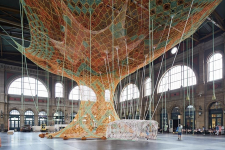 Foto: Hauptbahnhof Zürich/Fondation Beyeler/Foto: Mark NiedermannDer Züricher Hauptbahnhof gilt mit seinen knapp 3.000 Zugfahrten pro Tag als einer der meistfrequentierten Bahnhöfe der Welt. Täglich passieren den Bahnhof mehr als 400.000 Menschen auf ihren Wegen von einem Ort zum anderen. Dabei sind die Gefühle, die die Menschen mit dem Bahnhof verbinden, oft bestimmt von Hektik oder Ärger, von Vorfreude auf einen Ankommenden, oder von der Trauer nach einem Abschied. An diesem Ort schafft Neto mit seinem monumentalen Werk GaiaMotherTree einen Moment des Innehaltens und der Kontemplation. Beim Betreten der Bahnhofshalle breitet sich die aus bunten Baumwollbändern handgeknüpfte, baumartige und farbenfrohe Skulptur vor einem aus. Die Gestalt des Werks erinnert an die Form eines Baums, dessen Krone sich unter der 20 Meter hohen Decke der Bahnhofshalle erstreckt. Der Blick schweift hinauf und lässt einen auch die Architektur der über 100 Jahre alten Halle bewusster wahrnehmen. Die Installation bietet nicht nur ein visuelles Erlebnis, sondern regt auch den Geruchsinn an: Die herabhängenden tropfenförmigen Elemente sind mit duftenden Gewürzen und getrockneten Blättern gefüllt und verbreiten einen betörenden Duft in der Bahnhofshalle. GaiaMotherTree wurde vollständig von Hand gefertigt. Die Stoffbänder aus Baumwolle wurden mit Naturfarben gefärbt, anschließend in einer Fingerhäkeltechnik geknüpft und zu einer gigantischen durchsichtigen Skulptur zusammengeknotet. An der Wurzel des Baums befindet sich ein großer begehbarer Raum, in dem die Besucher verweilen und sich auf kreisförmig angeordneten Sitzgelegenheiten niederlassen können. So wird das Werk in der Hektik des Alltags zu einem Ort der Begegnung, der Interaktion und der Meditation. Ein vielfältiges Veranstaltungsprogramm für Erwachsene und Kinder mit Musik, Workshops, Führungen und Vorträgen findet im Inneren statt und belebt noch bis 29. Juli die alte Bahnhofshalle. Danach ist der Zauber von GaiaMotherTree wieder vorbei – es bleibt nur zu hoffen, dass er in den Köpfen der Menschen noch lange anhält.