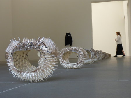 In der Ausstellung stolpern wir fast über die erste Arbeit, And Babies des amerikanischen Künstlers Michael E. Smith. In einer Reihe weisen ein Dutzend stacheliger, präparierter und aufgeblasen wirkender Kugelfische am Boden liegend den Weg in den Ausstellungsraum. Die Fische scheinen durch ihre hellen Dornen wenige Zentimeter über dem dunklen Museumsboden zu schweben.