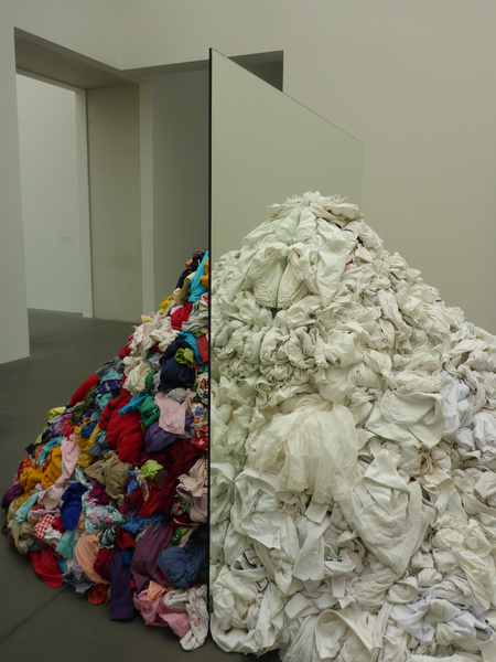 Am leuchtenden Pullover vorbei, in einem wesentlich kleineren Raum, befinden sich zwei Arbeiten des italienischen Künstlers Michelangelo Pistoletto. In Metamorfosi wird ein Berg Klamotten mit zwei Spiegeln in eine knallbunte und eine weiße Hälfte geteilt. Im ersten Moment wirkt der Berg auf mich, als sei die bunte Seite mit einer ordentlichen Portion Bleichmittel gewaschen und auf der anderen Seite gespiegelt worden.