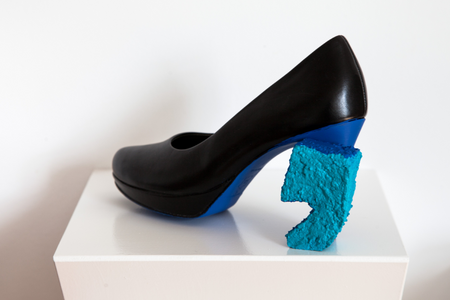 Ute Fabers Kunstwerk ersetzt den Absatz eines High Heels mit dem Apostrophen und stellt so die Frage: Was macht eigentlich so ein Absatz für eine Perspektive? Wie würde ich die Welt in diesen Schuhen sehen und weist der Apostroph hier womöglich auch auf die Gendergap hin?