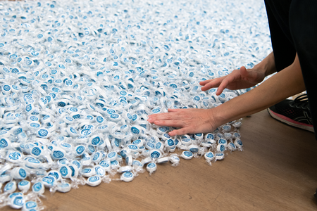 Detailansicht von Felix Gonzalez-Torres, „Untitled” (Lover Boys), 1991, Spiralförmig blau-weiße Bonbons in durchsichtiger Folie, unbegrenztes Angebot, Gesamtmaße variieren je nach Präsentation, Idealgewicht: 161 kg. © Estate of Felix Gonzalez-Torres, Courtesy of the Felix Gonzalez-Torres Foundation, Foto: Elisabeth Greil, Bayerische Staatsgemäldesammlungen, Museum Brandhorst, München