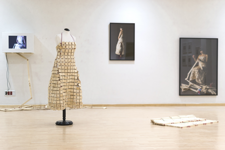 Im Gegensatz zu Judith Manns zartem Nass fühlt sich Tamara Jacquins Arbeit eher hart und kantig an. Für ihr Projekt Body Architecture IV baute sie ein Kleid aus Holz und trug dieses Kleid bei einer Performance selbst. Für die Künstlerin steht das relativ schwere, unbequeme Kleidungsstück für die Last, die Frauen im Rahmen gesellschaftlicher Erwartungen zu tragen haben, und die Ironie, dass die schwer zu tragenden Dinge teilweise immer wieder selbst neu erschaffen werden. Dieses Gewicht spürt sie durch das Kleid sprichwörtlich selbst.
