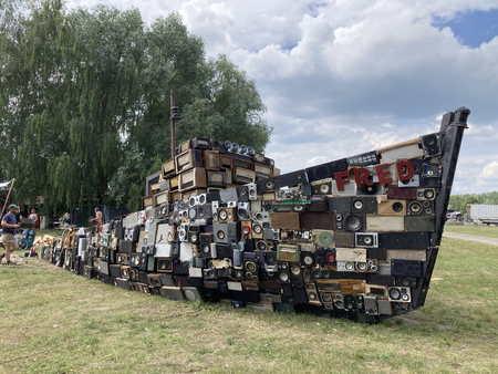 Benoît Maubrey: SHIPWRECK. Interactive sound sculpture (2023). 350 connected loudspeakers, line in, Bluetooth receivers, microphone and sampler machine/ Loopbardo (Subardo/ Andreas Frieser). At FUSION festival (near Berlin). Team: Emmanuel Ott, Gerrit de Vries, Philipp Steinkellner, Marko Gutman