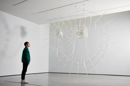 Cerith Wyn Evans will debut a major new work comprising two intersecting arcs of glass crystal musical flutes suspended in the gallery space. Powered by two mechanical lungs that inhale and exhale according to a specially-conceived algorithm, the 40 flutes are individually pitched to perform Wyn Evans’s new composition. Wyn Evans often incorporates sound into his work and orchestrates his installations within architectural structures to influence the audience’s spatial experience. His interdisciplinary and multilayered practice fuses intellectual rigour with poetics.