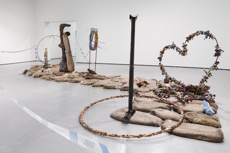 Installation shot of Michael Dean's "Having you on" in The Hepworth Prize for Sculpture. Photo,
