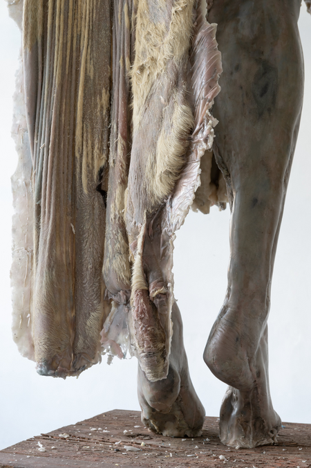 Let’s rewind for a moment. Around 2000, the artist became known for her imposing horse bodies, which in their strength and dignity, refer to Flanders Fields, the Flemish battlefields of World War I. Together, these reclining and hanging horse carcasses form tableaus. The haunting figures urge the viewer to identify with them, and sympathize with their pain. The next 20 years, the themes of suffering, life and death, torture and consolation, will not be abandoned.