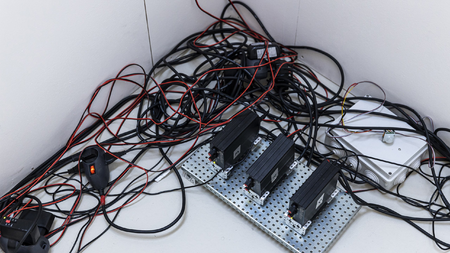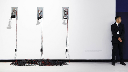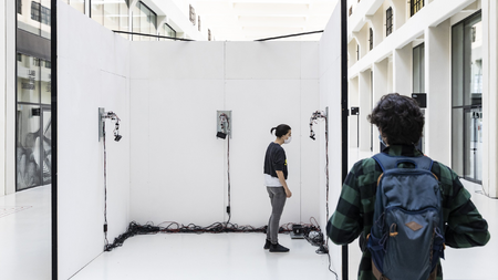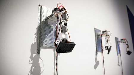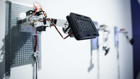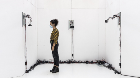 Emilio Vavarella, Do You Like Cyber?, 2017, site-specific sound installation with three robotic parametric speakers, variable dimensions, view of the installation at Transart Festival, Futurological Congress, Noi Techpark, Bolzano, Italy,  courtesy the artist