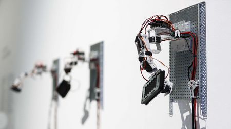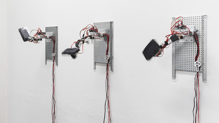 The production of these arms reflects my desire to produce objects that defy complete understanding. This was my way of addressing a physical reality in which we literally move through fields of information that constantly excite but also partially escape our senses. Overall, the robotic arms functioned as physical agents within a field of operations that they engendered and that included their movement, sound, and the movements of the public.