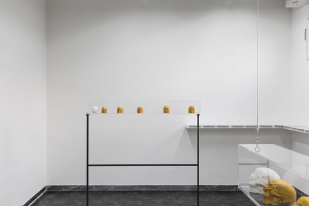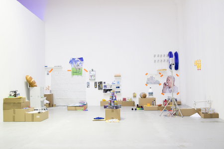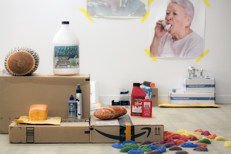 Most of the sculptural qualities of this work come from the actual products featured in the installation, but also from the way these are juxtaposed and presented, using shipping boxes as stands. We can also understand this installation as an ever-growing sculpture. Every time the work is presented it absorbs its production budget and new products are bought and added to the installation. The resulting artwork gets increasingly larger and ends up invading the exhibition space, similarly to how cancer slowly takes over a body or to how capitalism is taking over every facet of our reality.