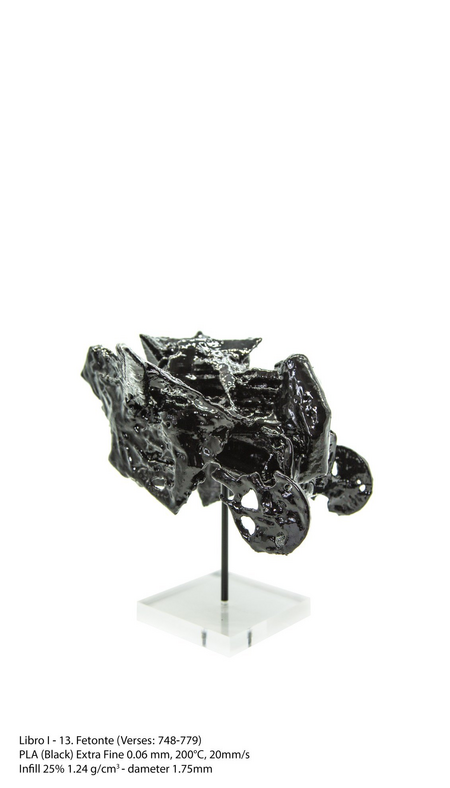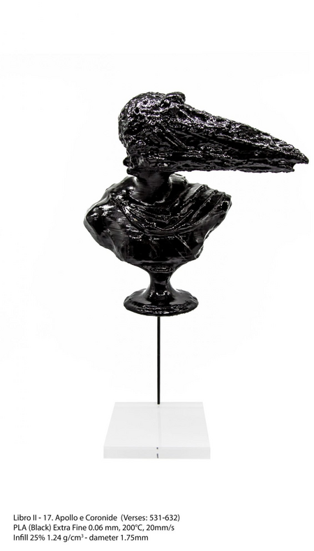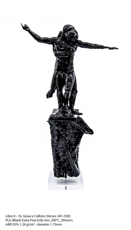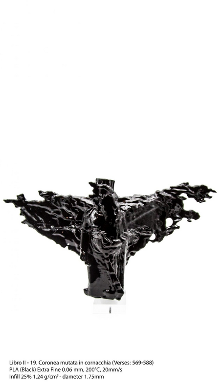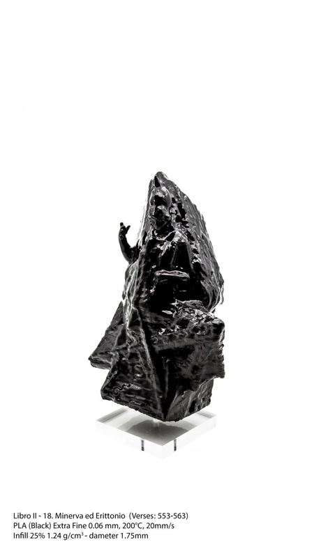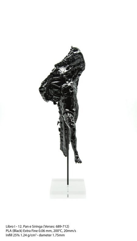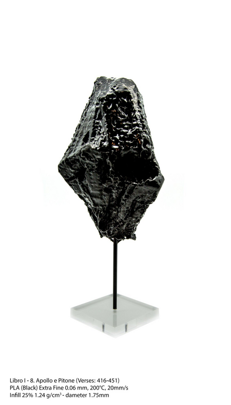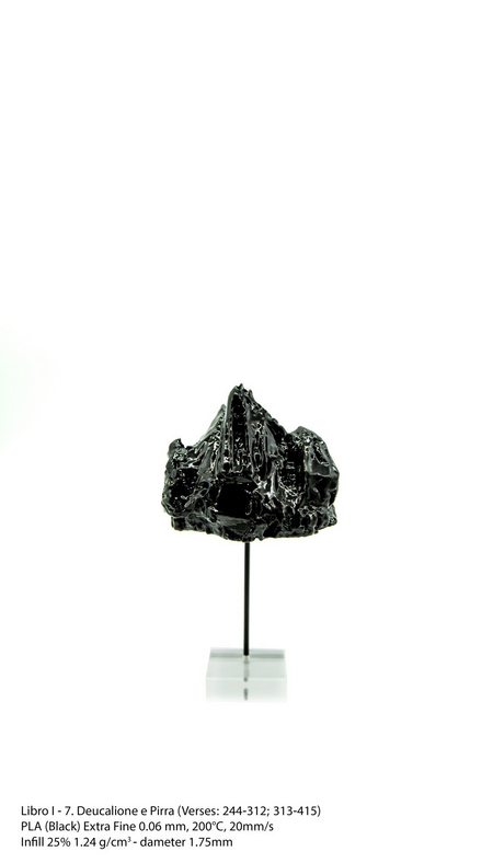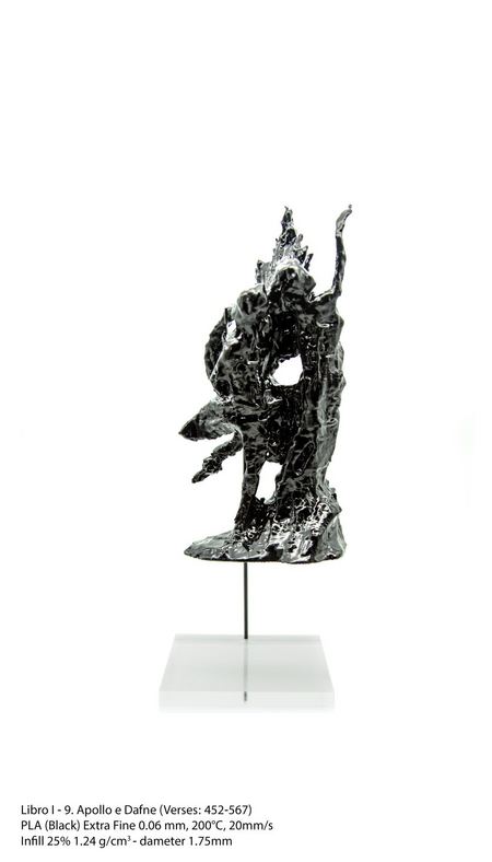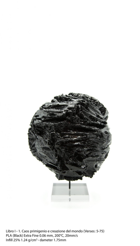 To produce each sculpture, I simply substituted the alphanumeric lines of code used by the computer to render the sculpture with the corresponding original Latin verses of poetry written by Ovid. For example, the first myth, “Primordial Chaos and Origin of the World,” corresponds to lines 5-75 of Ovid’s Libro I, which I inserted in place of the lines of code 5-75 of the first digital sculpture. My operation, repeated analogously for each sculpture, forces the Latin poem to function as source code for tridimensional forms. Even in this case I have no control over how the computer will interpret the Latin poem – the final shape of the sculpture is the result of a metamorphosis of data determined by my 3D printer’s settings.