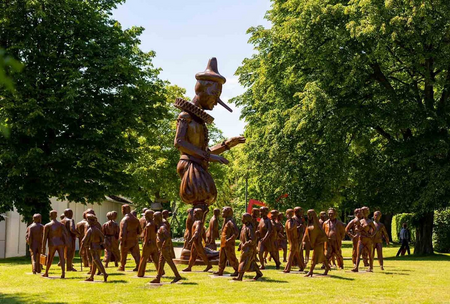 The exhibition in BĂĽdelsdorf is full of contrasts: stringent construction of sculptural statics and changing dynamics meet the love of depiction, often naive narrative. Abstraction and cubism stand next to proactive figurativeness. Above all, the sculptures and statues placed in the park invite one to take a (not always edifying) stroll. There are thought-provoking, curious, and many original things to see. Not all the works are convincing. Some have been there for a long time. Some are new this year. The remarkably independent imagery of some works competes with the interchangeability of others, which seem as if they were made yesterday or even the day before. Political discourse, subtle poetry, and progressive international art events are at odds with the banality of the providential everyday.Â