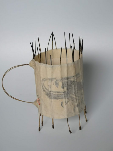 In the works of Jūra. A. Vaškevičiūtė, the exploitation of the earth and the complete exhaustion of its resources is a central theme. Also inscribed are the thoughts on environmental protection and what mankind returns to nature as garbage and dirt. The work of Vaškevičiūtė encourages reflection on one's own behavior and points out what every human being wants to leave to their descendants, or what will no longer exist through exploitation. In her work Thirsty, the artist reflects the fragility of earth’s natural and ecological system and alludes to the current zeitgeist of "always wanting more" and the ruthless wastefulness of today's generations. The container, which stands on many thin legs, reminds one, also because of its "handle" attached to one side, of a vessel which, however, has several small holes in the raised base, so that its contents, can run out again. Only coarser remnants could remain in the vessel, be collected and used again. However, any remnants that remain are difficult to get out of the container, as it also has many thin and sharply protruding metal projections on the upper side. The work Thirsty in its form as a container thus counteracts itself and symbolizes the eternal thirst for new and ever more.