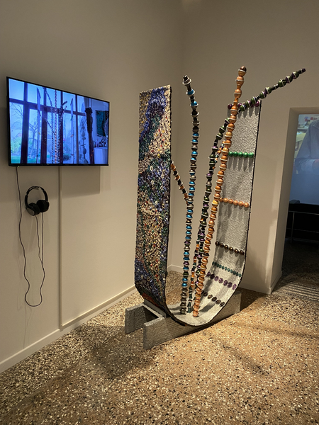 The artist is showing such a pair of steles from the Guardian series in the Palazzo Mora, a combination of different raw materials (objets bruts) and found objects (objets trouvés) that is characteristic of her work. It is made from flamed reclaimed wood, raku-fired clay and used hammers connected with copper-colored metal threads. The two steles appear like living beings, transported from a time long past or from another world, who now stand side by side, still and motionless. They radiate something archaic, almost majestic, which eludes any interpretation.