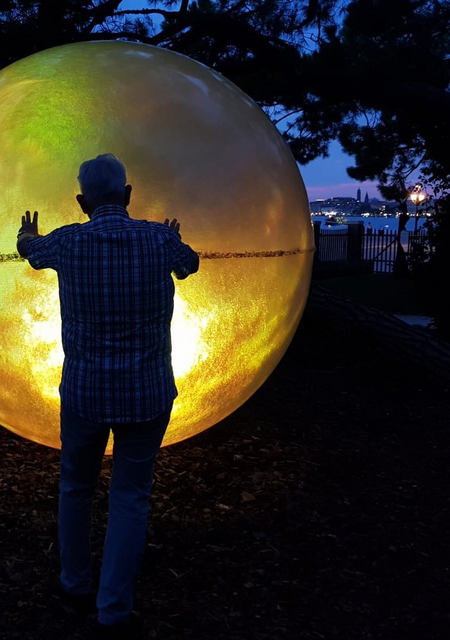 Our journey began in the Giardini di Marinaressa Sculpture Park of the European Cultural Centre. There the artist Anton Kerscher presented his metal sculpture Hey You (2018/19). The metal body of the monumental work has been worked on several times, has holes and has been visibly damaged despite the strength of the material. A deformed hemisphere, reminiscent of our earth, almost seems to break under the enormous weight of his feet. Only a large, shiny, golden index finger has been preserved and points to each individual visitor. It calls for personal responsibility towards the present problems of our world. The sculpture is part of the international exhibition project Personal Structures of the European Cultural Center, which, alongside Kerscher, presents around 200 international artists from 40 countries in the Giardini Marinaressa, Palazzo Bembo and Palazzo Mora. After a visit to other works by Carole Feuerman, Nadim Karam, Clifton Manghoe and more, the impressions of the first evening were discussed at a reception overlooking a Venetian sunset.