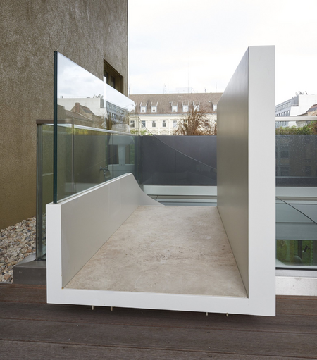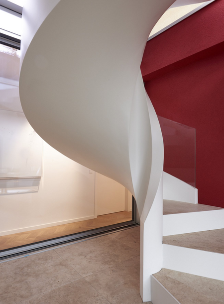 They have succeeded extremely well producing an impressive spiral staircase made of untreated steel with a sweeping design. The complex 3-dimensional cladding on the underside, which is axially displaced, is remarkable, along with other features. The inner edge of the curved sheet metal is 50 mm lower along the axis than the outer edge. The staircase is enclosed by a railing made of curved safety glass. The almost playful lightness of the entire multi-story unit is captivating.