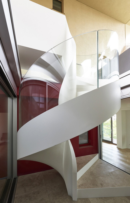 The jury awarded the design of the multi-storey staircase as an artistic spatial sculpture with female forms and timeless beauty: this idea and its perfect implementation was honoured with the award "Staircase of the Year 2018" in the sculpture category. The individual elements of the system, such as the sophisticated metal construction, the self-supporting glass railing and the innovative natural stone step covering also contribute to the impressive effect of this staircase.