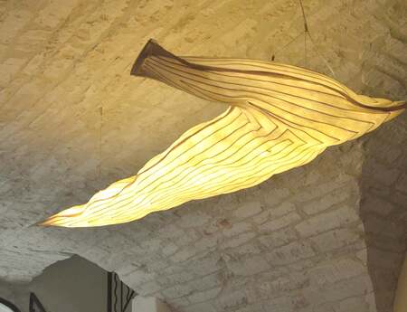 Komplexe organisch-skulpturale Formen aus durchscheinenden Pflanzenpapieren, eine Welt wie aus Wolken, Weichtieren und Schimären. Spuren einer Geschichte durch ein Flechtwerk natürlicher Fasern. Geheimnisvolle Lichtgraphiken durchstreifen das ungewöhnliche Material.