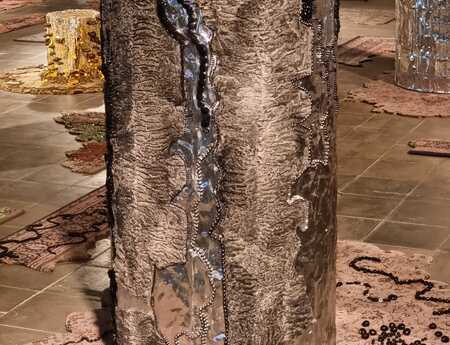 At the time of Corona she could fully focus on making art. Each tree trunk 'preserved' in aluminum became a blank canvas on which Bianca Runge 'paints' with excess beads. The beads, chains and other luxury items used proliferate on the aluminum like moss, fungi or bugs. Cut carpets open new paths on the ground and remind us that we can also make different choices. Giving nature a voice.