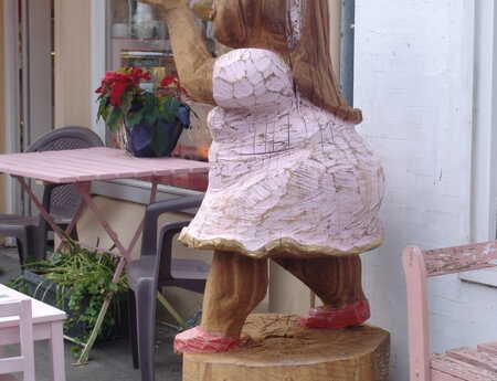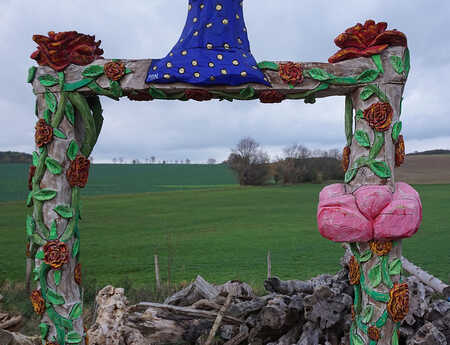 Seine Skulpturen, die er aus verschiedensten Holzarten mit der Kettensäge erschafft, sind Ausdruck wieder gewonnener Kindlichkeit und pointieren oft die sensiblen Seiten unseres Daseins: Peinlichkeit, Empfindsamkeit, Angst.“