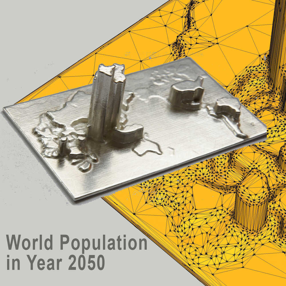 World population in year 2050. Indian population (one of the two towers) will have surpassed China. The CAD-designed sculpture is made of Sterling silver ("925"). The underlying digital model can be animated and country data be provided.