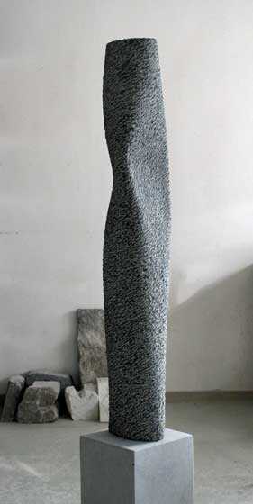 I regularly make sculptures inspired on a small movement, rotation or bend (see also my sculptures "Fier" and "Whispering"). While working, such a sculpture remains formless for quite a long time. It only comes to life when there is good tension on the surfaces. Nice to work towards that. And although this sculpture is quite large, everything is carved by hand. It is made Irish bluestone. Suitable for outdoor use.