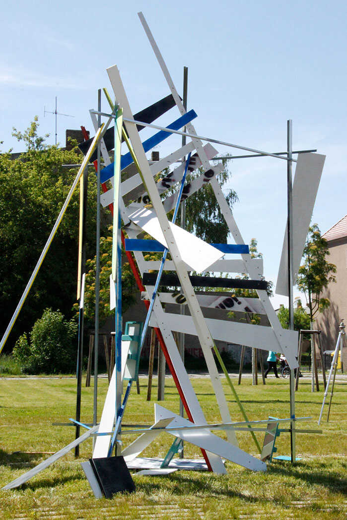 It's the second Unknown Manuscript Forst (Lausitz). The installation was gradually constructed over a period of 90 minutes. Metal rods were placed in and around the triangular metal structure. Colored and text-printed plywood pieces were loosely inserted as text modules, along with mirrors.