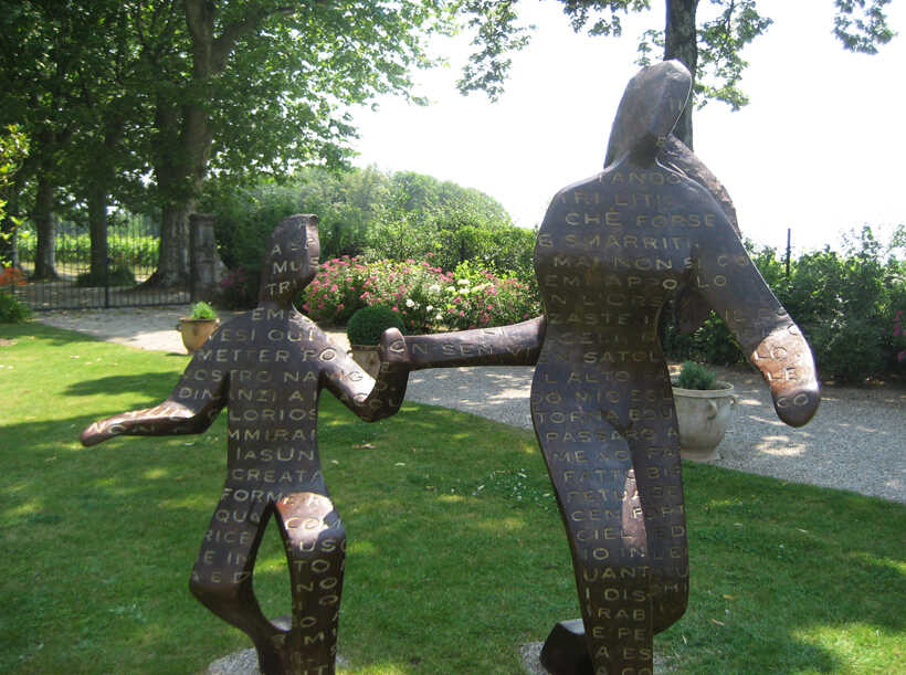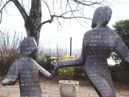 The engraved text is from Dante Aligheri’s Paradise, Canto II. The full text is only visible if you read the letters written in the air between the sculptures. This