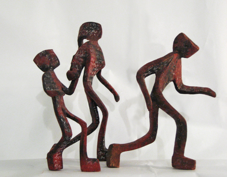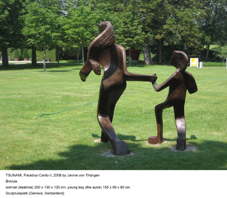 Life-size silhouettes of figures fleeing from the Tsunami are cast in thin iron. These shadows are inscribed with the names of the thousands who lost their lives in the disaster. As these figures are touched by the viewer and sway in the wind, they become the runners between this world and the next. The flatness of the figures was inspired by the distinctly flat, rather than ‘fleshy’ Adam in Paradise
