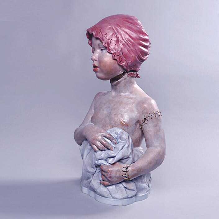 The transfigured romantic projections of a good and loving mother and the contemplation of the real person do not create a homogeneous picture. The different projections do not add up to a homogeneous picture but instead create a lot of cracks and fractures.but rather cracks and breaks:  Sewing the parts together with a golden thread is both a material operation and a way of depicting the ambiguity of motherly love.