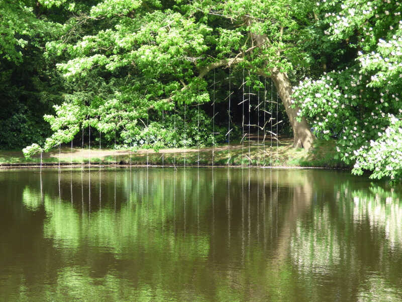 A serene and playfull installation with sticks in threads pending above a lake from the branch of a tree.
