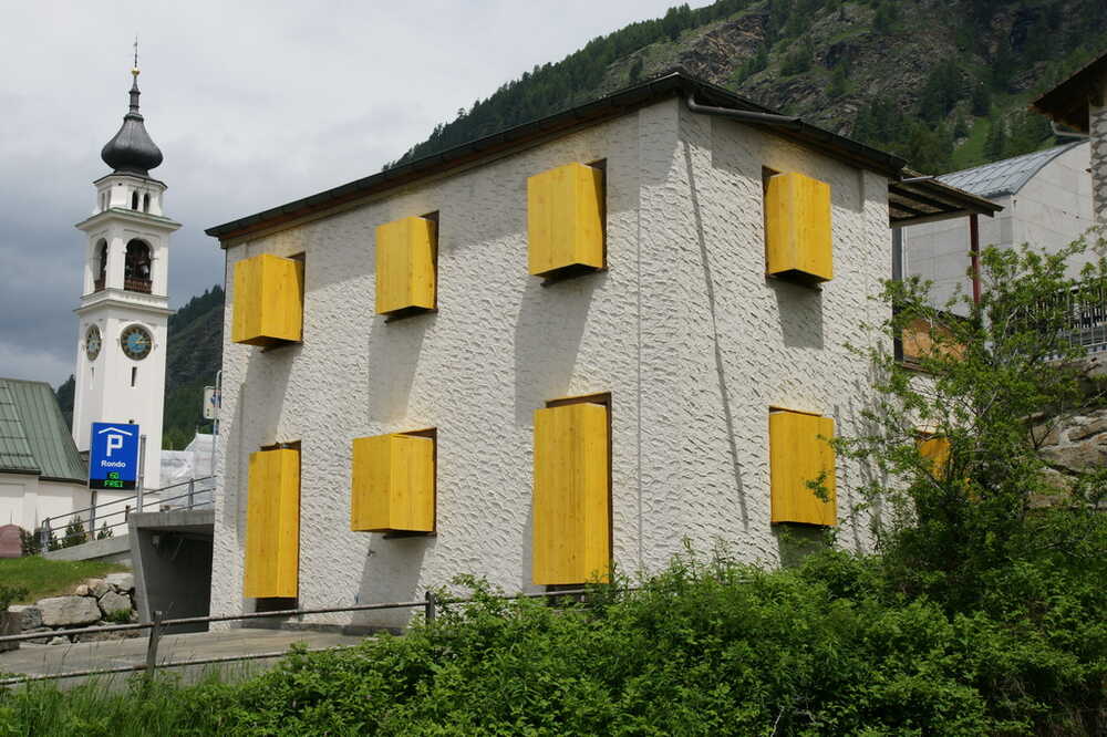 Temporary installation with construction material at a house to be destroyed (Kunstwege, vias d'art Puntraschigna / Pontresina