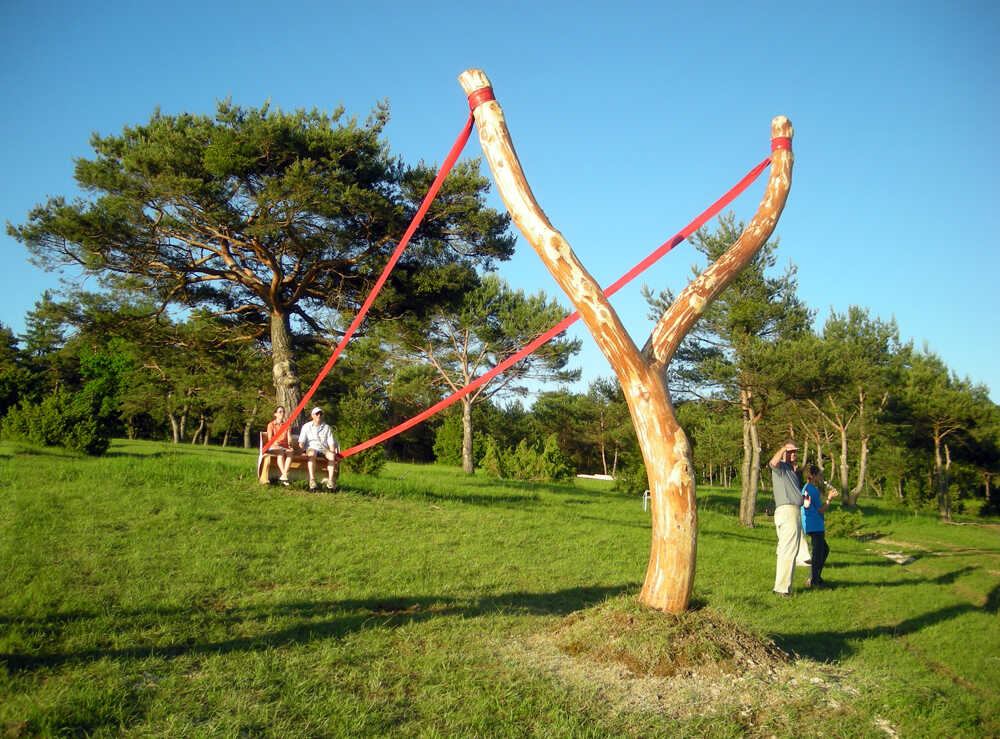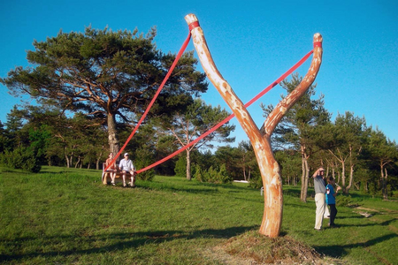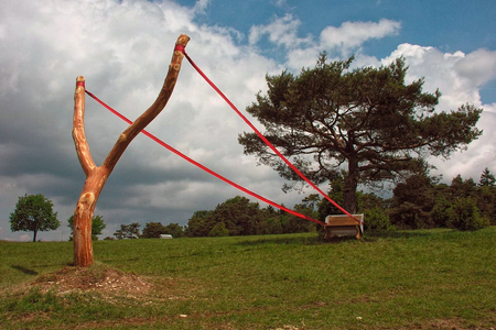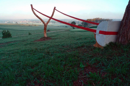 Here, on the vineyard stands her Schleudersitz. A romantic bench under a tree invites tired walkers to rest and contemplate the vast view. But the bench is stretched into a giant slingshot by a red rubber strap, ready to get shot right across the Danube Valley.