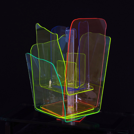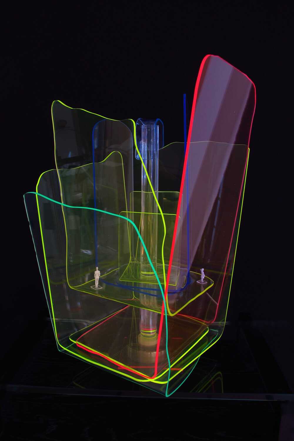 Fluorescent acrylic glass allows me to work with transparency and the "glowing" edges bring light into the artwork. I put the miniature figures to give space a dimension.